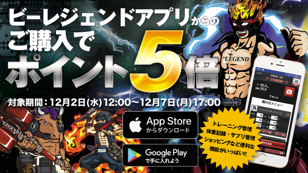 プロテインで初めてモンドセレクションを6年連続受賞中のビーレジェンドプロテインを展開する、株式会社Real Style(本社:奈良県大和高田市、代表取締役:鍵谷 健、以下弊社)は2020年12月2日(水)12:00から12月7日(月)17:00までの期間限定で、ビーレジェンド公式アプリからのご注文でポイントが5倍になるイベントを開催いたします。