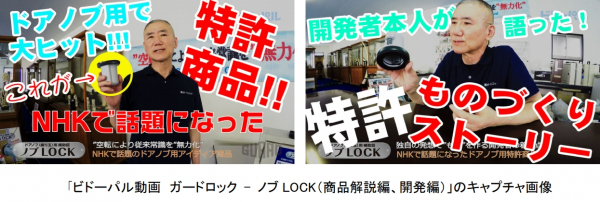 そこで弊社は、もっと多くの方に製品の魅力を伝える方法として、オリジナル動画の共同制作と動画の一般公開を提案し、この度ハイビジョンでの動画制作をさせていただくこととなりました。シリーズ第一弾動画として、ガードロック製品の中でもNHKニュースで話題となった「ノブLOCK」の解説動画を公開いたします。