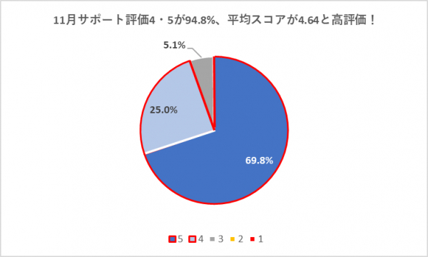 TORAIZでは、日本語を話すイングリッシュ・コンサルタントとレッスンを担当するネイティブコーチの2名がチームとして、受講生の英語学習をサポートしています。イングリッシュ・コンサルタントのプログレスチェック時のコーチングと、ネイティブコーチのティーチングに対して、受講生が5段階の星評価付けを行う自社システムを運用しています。2020年11月の平均スコアは、コーチのレッスン評価が4.59、コンサルタントのサポート評価が4.64と、引き続き受講生からの高い評価をいただいています。