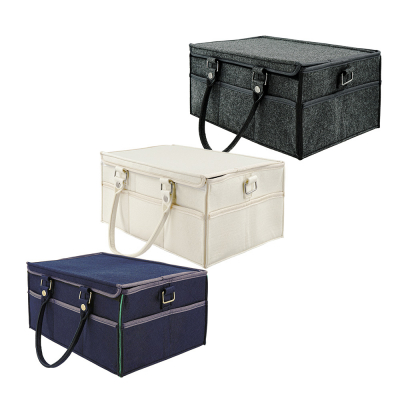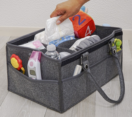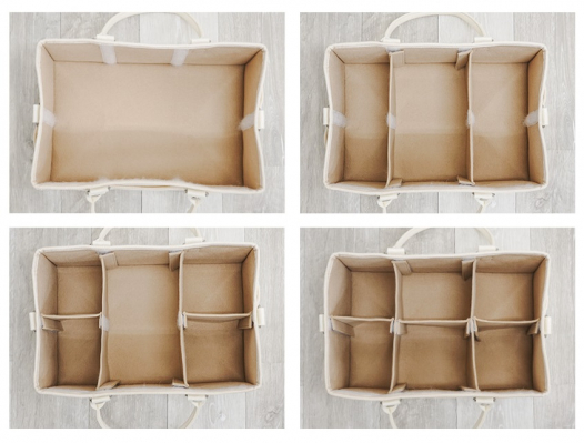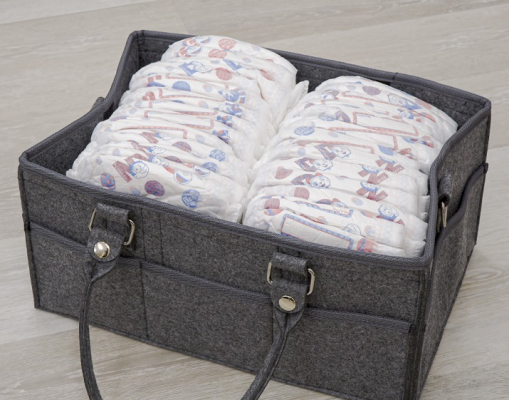 どこに何が入っているかが一目でわかるボックスタイプで、紙おむつの残量もすぐに確認することが出来ます。また、厚手のフェルト素材を使用し、ふちにはパイピング処理が施されており、丈夫でほつれにくい仕様です。