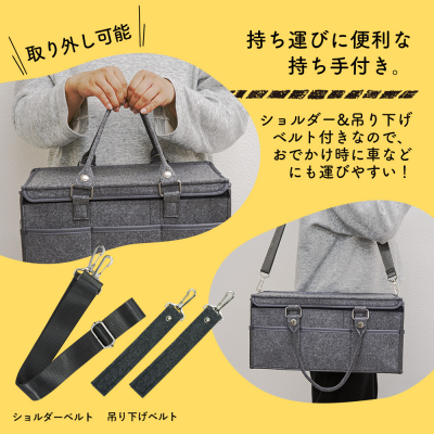 内容物 : 本体、蓋、仕切り(大×2、小×3)、持ち手×2、ショルダーベルト×1、吊り下げベルト×2