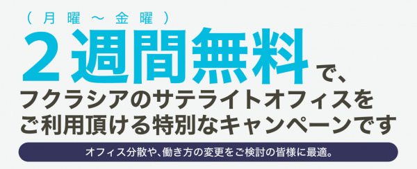 そんな想いより、フクラシアはそのハブとなる拠点としての“サテライトオフィス”を事業として展開中です。そしてこの度、フクラシアのサテライトオフィスを“2週間無料”でご利用いただき、今後のオフィス戦略において適切な場所かをシミュレーションしご判断頂ける機会を設けようと、新たにキャンペーンを展開する運びとなりました。