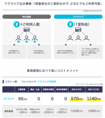 一般的なサテライトオフィスの契約方法は、「費用×利用人数分」でのコストがかかってくるところ、フクラシアなら「1室の料金」でご契約となり、他社よりコストパフォーマンス高く、明瞭な金額設定が特徴です。