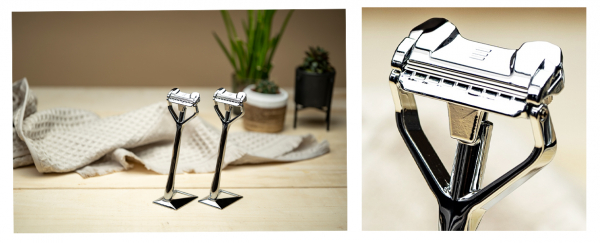 もう従来の高価な替刃ヘッドは不要です。替刃は市販されている両刃カミソリを半分にカットして利用可能。圧倒的な替刃コスパを実現しました。