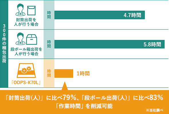 梱包出荷機「ODPS-K70L」はこれまで一人あたり1作業で60秒ほどかかっていた梱包出荷業務を、約12秒と、作業時間を1/5に圧縮し、これまでの出荷工程人員を別工程に配置する事で工場人員の最適化を実現します。
