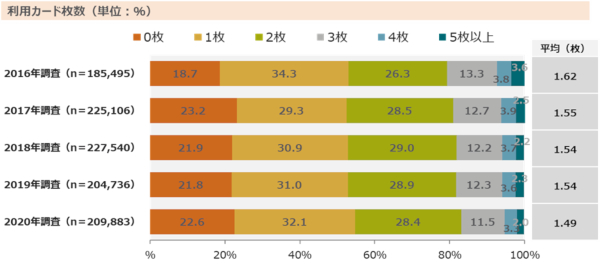 当調査では、約50種類のクレジットカードを特定し、利用場所、利用金額などを聴取しています。直近6か月間で利用されたカードの総枚数は311,934枚。20万9千人の日本の消費者は1人当たり平均約1.49枚のクレジットカードを利用していることがわかりました。2016年調査時点から平均利用枚数は減少しています。