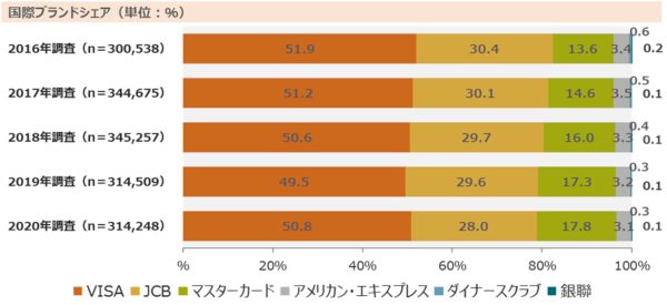利用されたカードの国際ブランドシェアはVISAが50.8%、JCBが28.0%、マスターカードが17.8%でした。JCBの縮小、マスターカードの拡大が明らかとなりました。