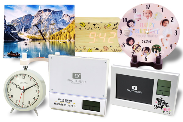 日常生活の中で、時を刻み続ける時計。卒業記念や創立記念などの記念品として人気の商品です。スタイリッシュなデザインから、フルカラーで写真がプリント出来るものまで豊富に取り揃えております。チームや団体の記念品としてロゴや日付を入れるのはもちろん、個人用で家族写真やペットの写真、ライフイベントの思い出の写真などをプリントするのもおすすめです。