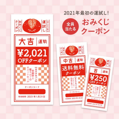 次回購入時に使える、大吉:2,021円・中吉:送料無料・吉:250円割引のおみくじクーポンを一緒にお届けいたします。大幅値引きとなる大吉クーポンはもちろん、「少量だけ冷凍パンを買いたいけど送料が・・・」というお客様のお悩みにお応えした、オンラインストアを気軽にご利用いただける中吉・送料無料クーポンなど、お得なクーポンが当たる大チャンス!新年最初の運試し、何が当たるかお楽しみに。
