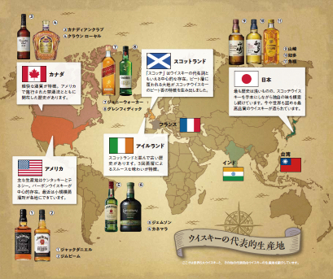 ビジネスパーソンなら知っておくとためになる、ウイスキーの主な産地の世界地図、代表的なウイスキーの分類図も掲載しています。