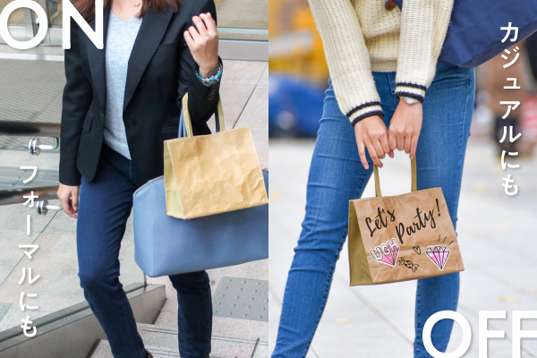 布製のカバンではアレンジにも技術を要しますが、SHIDUKU-紙作-は紙製なので、貼る、描く、塗るも画用紙に描く感覚で自由にカスタムができます。紙の表面にはワックス加工がしてあるので、シールやステッカー、マスキングテープなどを貼り直すことも可能となり、まるで革製品のような味も生まれてきます。カスタムなしでも、シンプルな紙袋風おしゃれトートバッグとして、カジュアルスタイルにも、フォーマルスタイルにも合わせやすいデザイン。サブバッグとしてメインバッグにも合わせやすく、使い勝手の良いサイズ感となっています。