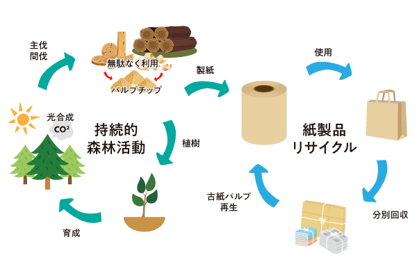 紙の原材料である木材は、ある程度成熟をした伐採を必要とする木を原料としています。さらに使用後の紙製品は、再生紙やトイレットペーパーなどの新たな紙製品へとリサイクルできるため、紙はサステナブルな優秀素材といえます。