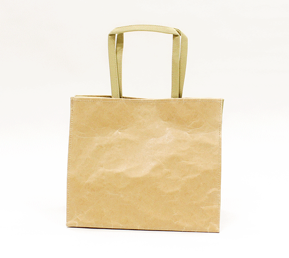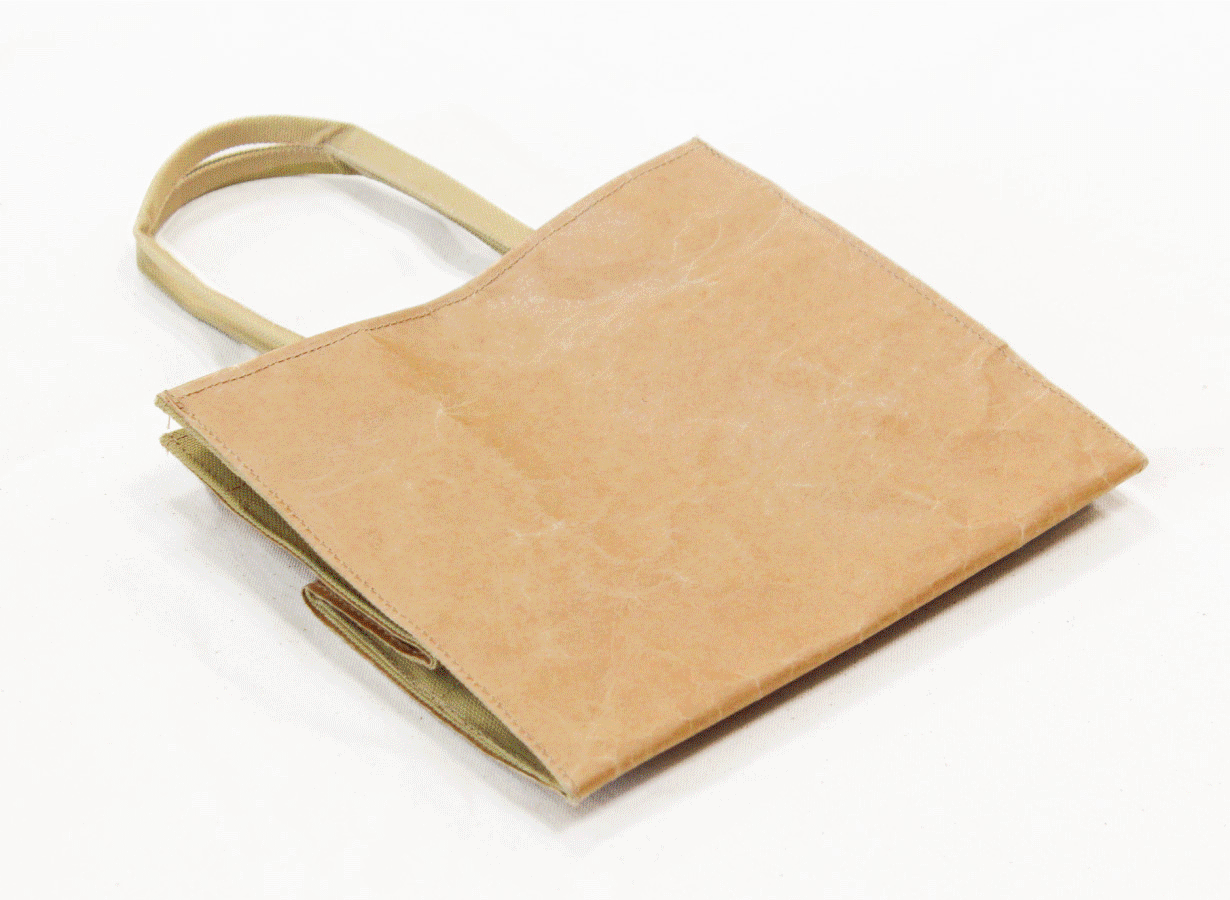 何度も使える紙袋風トートバッグを目指し、紙には汚れや水に負けないよう「ワックス加工」を施しました。紙袋のような"のり付け加工"ではなく"縫製"をすることで耐久性も担保でき、クラフト紙にのるステッチもとてもおしゃれ!また内面や側面、持ち手部分には布も使った"紙と布のハイブリット仕様"に。小さなポケットやマグホックがついているので、使い勝手も◎