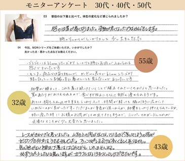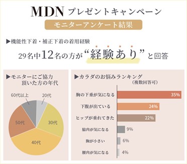 『MDN(エムディーエヌ)』プレゼント・モニターキャンペーンを実施したところ、アンケート回答率は約9割。着用体験レポートは「しっかり胸が入る感じがしてよかったです」「胸の位置が高くなった」などポジディブな意見が過半数を超えました。