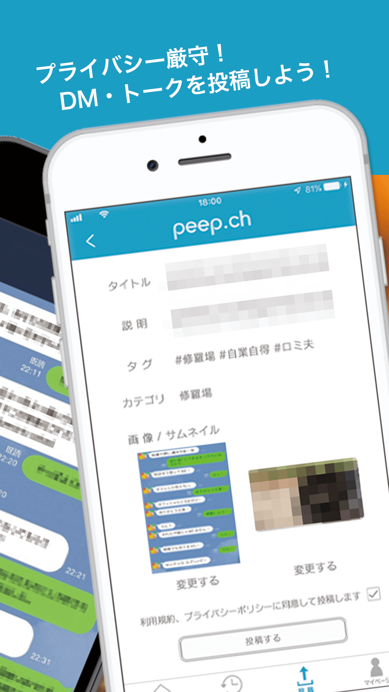 Peep.chはLINEやTwitterのDMをシェアして楽しめる、みんなのチャットをシェアして、覗き見しているような体験を楽しめるアプリです!