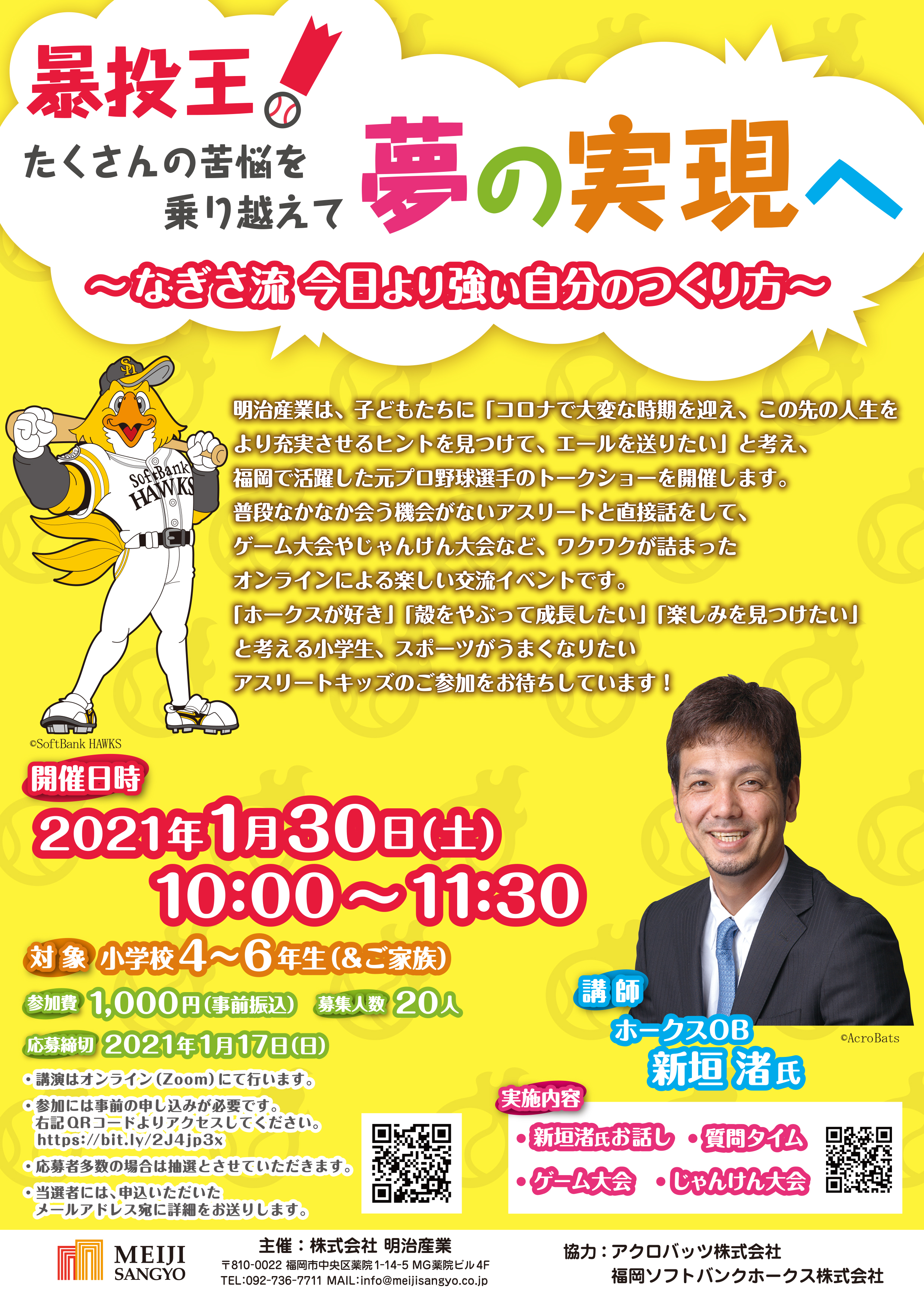 株式会社明治産業(福岡県福岡市:代表取締役 明永喜年)は、子ども向けのイベントとして、元ソフトバンクホークスの投手、新垣渚氏のトークショー『暴投王!たくさんの苦悩を乗り越え 夢の実現へ~なぎさ流 今日より強い自分の作り方~』を1月30日(土)10:00からオンラインにて開催いたします。