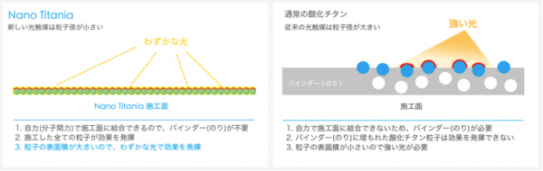・粒子2nm以下のチタン素粒子は表面上の原子に自己結合するため、バインダー(接着剤・のり)を使用して定着させる必要がありません。