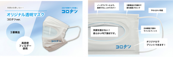 新発売する「透明マスク」は、まだまだ続くマスク生活において表情がわからずコミュニケーションがとりづらい状況を改善できる新たな商品になると考えています。また、「透明マスク」は本体にロゴなどを印刷できるため、自社のロゴを入れて社員へ配布したり、ノベルティなどにも活用いただけます。