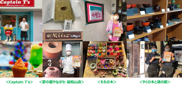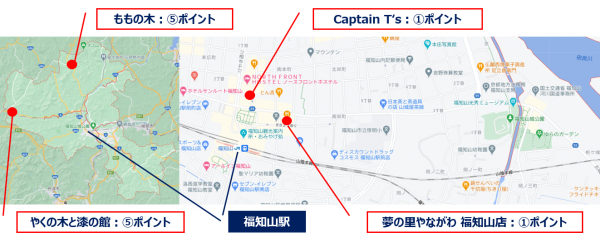 福知山駅周辺のスイーツ店の「Captain T's」と「夢の里やながわ 福知山店」は(1)ポイント、福知山駅から車で約30分の夜久野エリアにある「やくの木と漆の館」は漆かきのことなども学べる丹波漆の伝統を継承する施設で、漆塗りの体験教室などもあります。福知山駅から車で約20分の雲原エリアにあるカフェ「ももの木」とともに(5)ポイントに設定。
