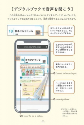 『小学生のための 聞ける!話せる! 英語辞典』は、スマホやタブレット端末と連動して動く「デジタルブック」が付いています。スマホの画面にタッチするだけで音声が聞けるので、英語の発音も同時に学習できます。また、各ページのコードをスマートフォン/タブレットから読み込むと「デジタルブック」にジャンプする機能があり、画面にタッチするだけで英語音声を聞くことができます。