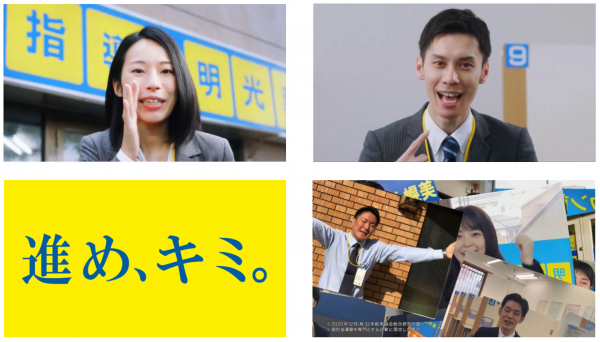 今回のCMテーマは「応援」。生徒とのコミュニケーションを大切にしている明光義塾だからこその親しみやすさと信頼感を直感的に伝えるべく、全国の明光義塾教室長が元気に歌いつないで生徒たちを応援する楽しいCMにいたしました。また、賑やかなCMの中、教室長たちの表情、歌、歌詞の内容を包括するメッセージとして「進め、キミ。」という、先が見えない不安の中でも、目標に向かって初めの一歩を踏み出すのはキミ、明光がついてるよ!という、明光義塾からのエールを直感的に強く伝わるコピーを採用しています。