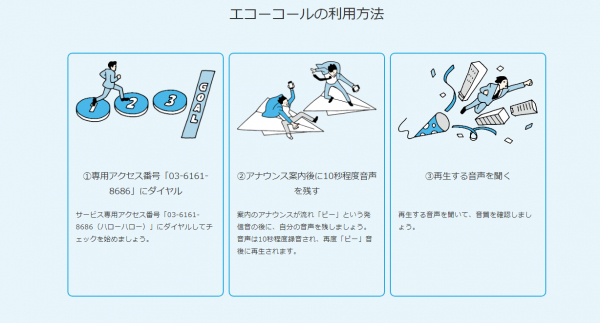 「音声が不安定」「大事な電話の前に確認しておこう」と思った時、専用番号に電話をするだけの簡単なサービスです。