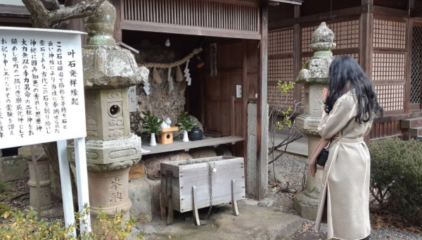 写真説明:これから世界大会に臨む佐治さんは、明智光秀を祀った御霊神社内にある「叶石」に必勝祈願!