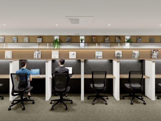 コワーキングスペースは一人で集中して作業が出来るよう「個」を意識したレイアウトになっています。また、コンセプトである「森の図書館」にちなんで、木の温もりが感じられる装飾やさまざまな種類の本をご用意 。仕事はもちろん、資格勉強などの自習用としてもおすすめのシェアオフィスです。デスクチェアにも拘り長時間の作業に最適です。