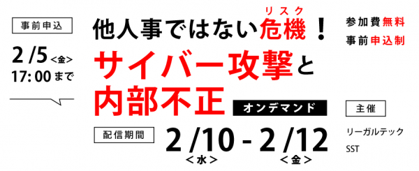 株式会社セキュアスカイ・テクノロジー(本社:東京都千代田区 代表取締役:大木 元 以下、SST)は、リーガルテック株式会社(本社:東京都港区 代表取締役社長:佐々木 隆仁 以下、リーガルテック)と、企業向けに「サイバー攻撃と内部不正」をテーマにしたオンデマンドセミナーを2月10日(水)~2月12日(金)に開催します。