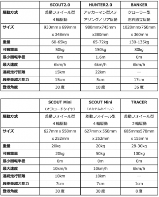 室内のフラットな路面を走行することを前提したTRACER(AGV)を除き、各UGV製品は、5cm~17cmの段差乗越え能力があり、貨物を積載した状態で、10度~36度の坂を登坂するなど、高い不整地の能力を持っています。たとえば, 主力の大型機、SCOUT2.0、HUNTER2.0, BANKERの3機種の主要なスペックは、以下の通りです。