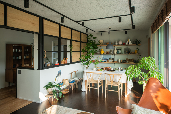 吹き抜け階段で2階とつながるリビングは、余計な仕切りや壁が無く、どこにいても家族とのつながりを感じられる空間です。テラスや窓からは十分な採光・通風を確保できるダイニングは、仕切りの一部をパネルで塞がず開放し、料理中でも家族の会話が楽しめるようになっています。また、クロス張りの壁、木毛セメント板の天井、黒の照明レールでアクセントをつけ、住空間にカフェの感覚を取り入れています。