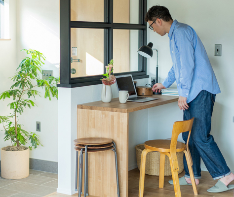 エントランスとキッチンの間に配置したフリーデスクは、ノートパソコンを使う作業にちょうどいい広さを確保。ガラスのサッシで空間を仕切りつつも、視界は遮らず、程よい開放感を感じながらリモートワークや読書などに集中できます。