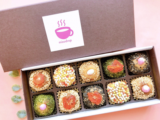 この度、バレンタイン限定商品として販売する「Duo」は、ごま、青のり、あられ、麩、ドライトマトなど植物性の材料を使用した「misodrop」を10個セットでお届けします。140年前の製法を踏襲した「うま味」たっぷりの本格味噌使用し、栄養価が高いことはもちろんのこと、ベースの味噌に白と赤のマーブルを用いた「見て楽しい食べておいしい」商品です。