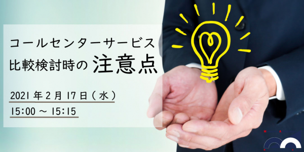 コールセンター代行サービスを提供しているマーケティングアソシエーション株式会社(本社:東京都文京区 代表取締役:相内あゆ美、以下当社)は、2021年2月17日(水)に、無料Webセミナー「コールセンターサービス比較検討時の注意点」を開催いたします。