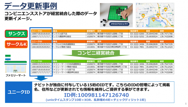 統合POIデータベースでは、管理番号として15桁の独自IDを採用しています。ID管理によって、個別データの掲載名、住所などが更新されても、情報を維持しご提供し続けることができます。