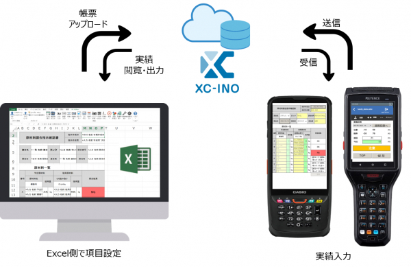 XC-INOはExcelで入力画面の作成を行うため、ハンディターミナル用のアプリを開発・管理するよりも手間なくお客様自身で運用し続けることができ、双方のメリットを生かした連携となっております。