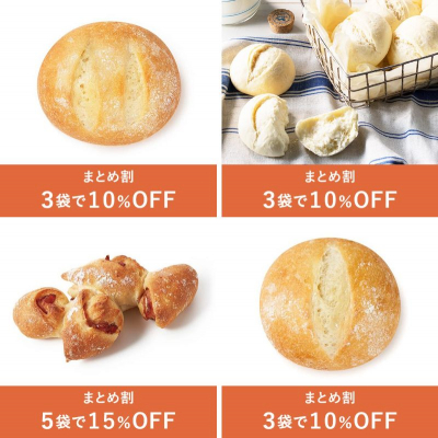 またコロナ禍でのボリュームパックのニーズを受け、冷凍パンをより種類豊富に日常的に楽しんでいただきたいという思いから、人気ランキング上位・リピーターの多いアイテムそれぞれ5袋で15%オフとなるまとめ割を昨年より開始。大変ご好評につき、さらに2021年1月27日(水)から、新たに4商品が追加となりました。
