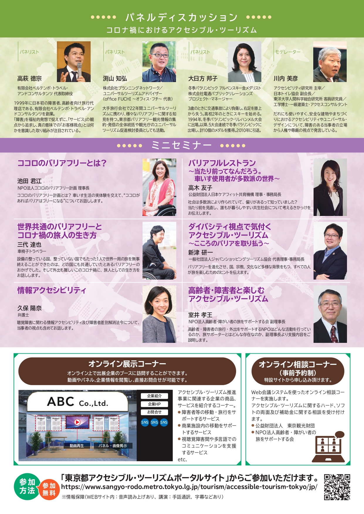 「コロナ禍におけるアクセシブル・ツーリズム」をトークテーマに、新型コロナウィルス感染防止のための新しい生活様式がニューノーマルとなる今後を見据え、観光産業におけるアクセシブル・ツーリズム振興上の課題を洗い出し、感染予防とホスピタリティを両立させる取り組みを考えます。