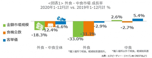 外食・中食市場情報サービス『CREST(R)*1』を提供するエヌピーディー・ジャパン株式会社(東京都港区、トーマス・リンチ代表)は、外食・中食市場2020年計の動向分析レポートを2021年2月9日に公表します。