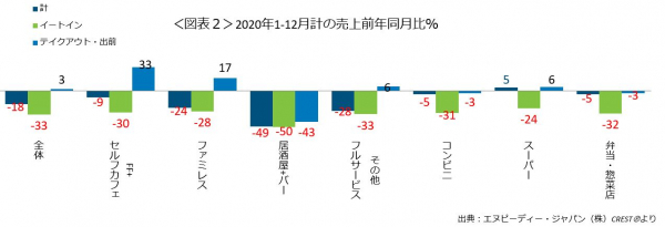 外食・中食市場全体の2020年1-12月計の前年比(図表1)をみると、売上(金額市場規模)が18.3%減少、客数(食機会数)が12.4%減少しました。外食(イートイン)売上が33%減でマイナス幅が大きく、中食(テイクアウト・デリバリー)売上は2.6%増でした。