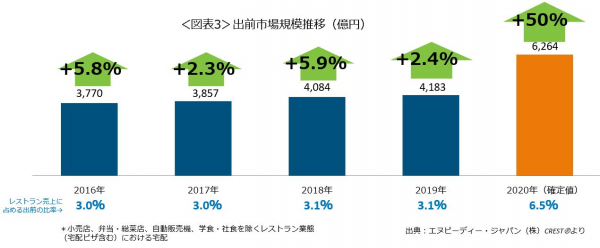 外食業態計(レストラン計)の出前(デリバリー)市場規模推移をみると(図表3)、2020年の確定値は6264億円で、前年比50%増でした。レストラン売上に占める出前(デリバリー)比率は、2019年3.1%から、2020年6.5%と2倍以上の比率となりました。