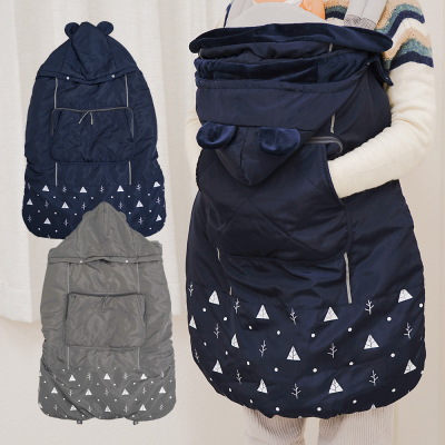 前向き抱っこ、向かい合わせ、おんぶ、ベビーカーの4つのシーンで使用できます。お出かけの際はいつでも暖かくできるので安心です。また、月齢が低い時期は裾を折りたたんでスナップボタンで留めて丈を短くすることができ、成長したら丈を伸ばして使用できます。さらに、ベビーカーに座って使用する際は、フットポケットから足を出すことができ、靴でケープ内が汚れる心配もありません。