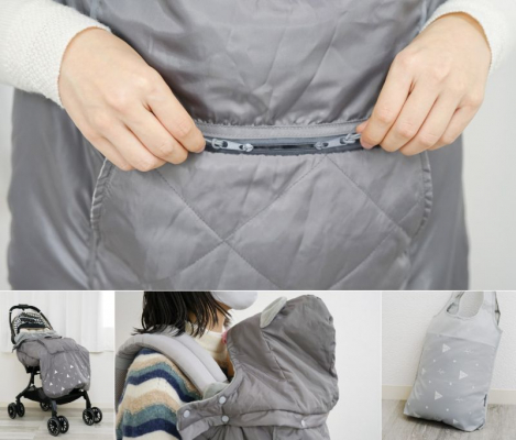 大人のように体温調節が上手くできない赤ちゃんには、寒い時期ケープのような防寒対策が必要です。また、ママ・パパが近場へお出かけや移動をする際は、赤ちゃんを抱っこした状態で財布やスマートフォンなどを持ち運ぶ必要があり、煩わしい場面が多くあります。そこで今回当社は、Wジッパーつきで貴重品も入れられる大型ポケットと、ジッパーなしですぐに物を取り出せる大型ポケットが付いた、防寒と身軽さどちらも叶える『ベビーマルチケープ』を開発いたしました。ポケットに必要な物を入れれば両手が空いた状態で動くことができ、お買い物や赤ちゃんのお世話もよりしやすくなります。