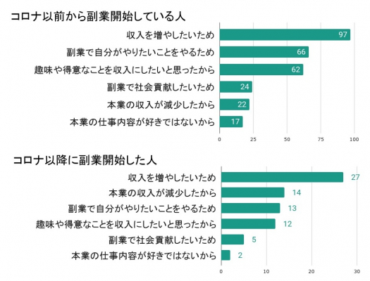 2位 コロナ前「やりたいことをやるため」 コロナ後は「本業の収入減」