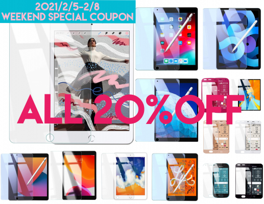 人気iPadやdocomoらくらくスマートフォンシリーズのガラスフィルムも、20%オフクーポン配布します。