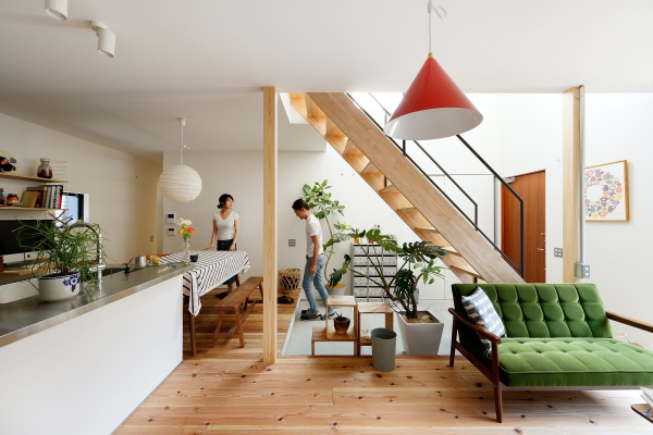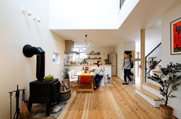 廻り階段を上がった2階の吹き抜けからは、家族が食事をしている様子が見えるなど、家族のコミュニケーションが深まる構造となっています。また、2階のテラスのある部屋は寝室として利用することで、朝には緩やかな光が差し込み、寝起きのいい朝やピクニック気分を楽しめます。