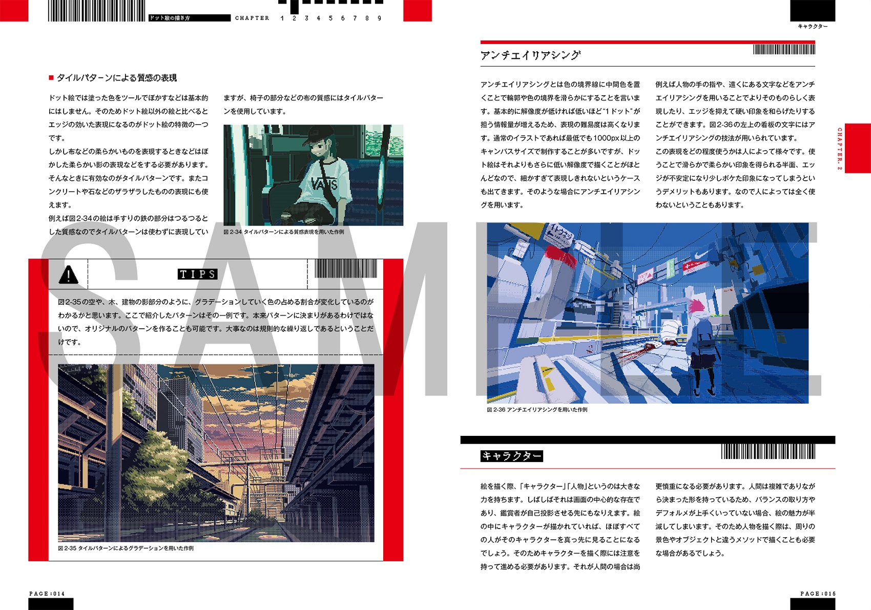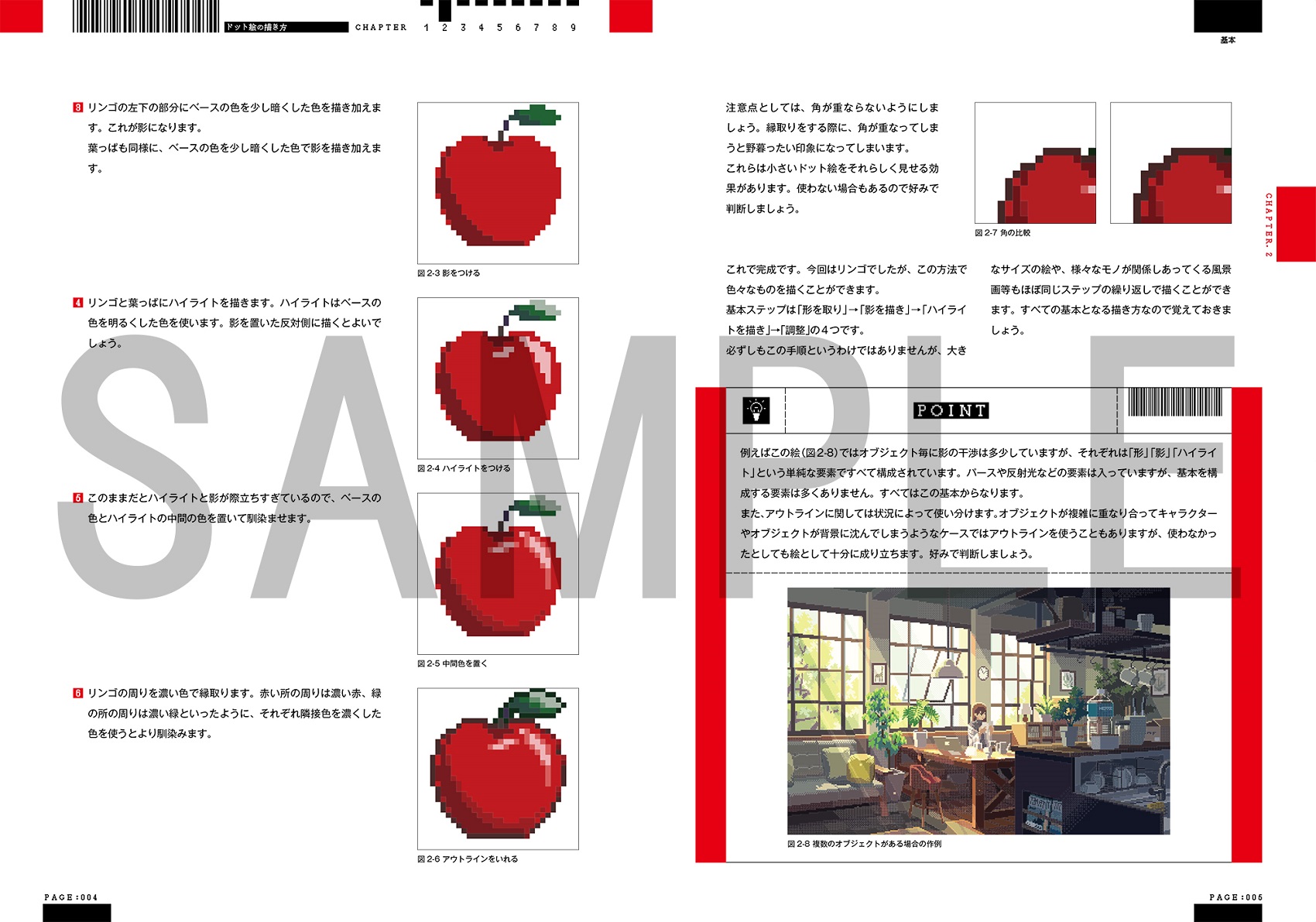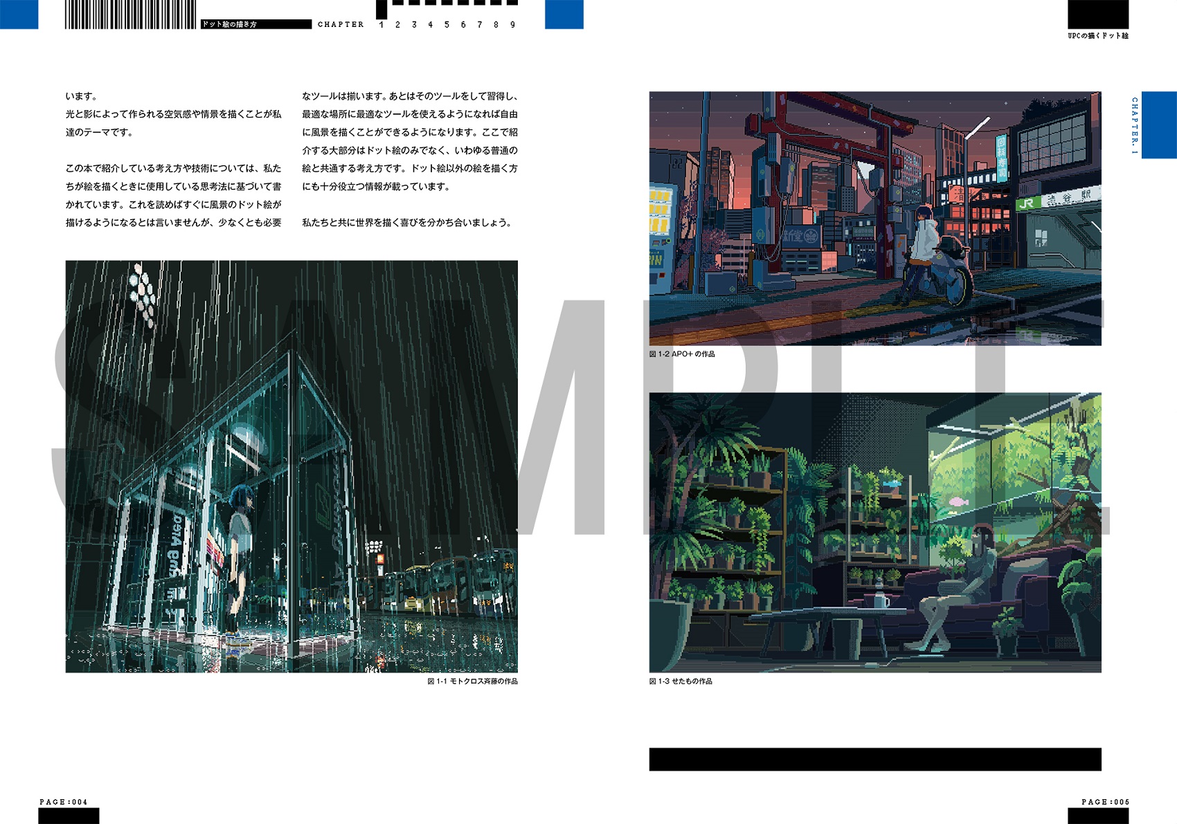前編はピクセルアート(ドット絵)の歴史や描き方からはじまり、色、光、構図、パース、テクスチャにいたるまで、背景シーンを描くために必要な基礎知識を多数のピクセルアート作品を用いて解説。
