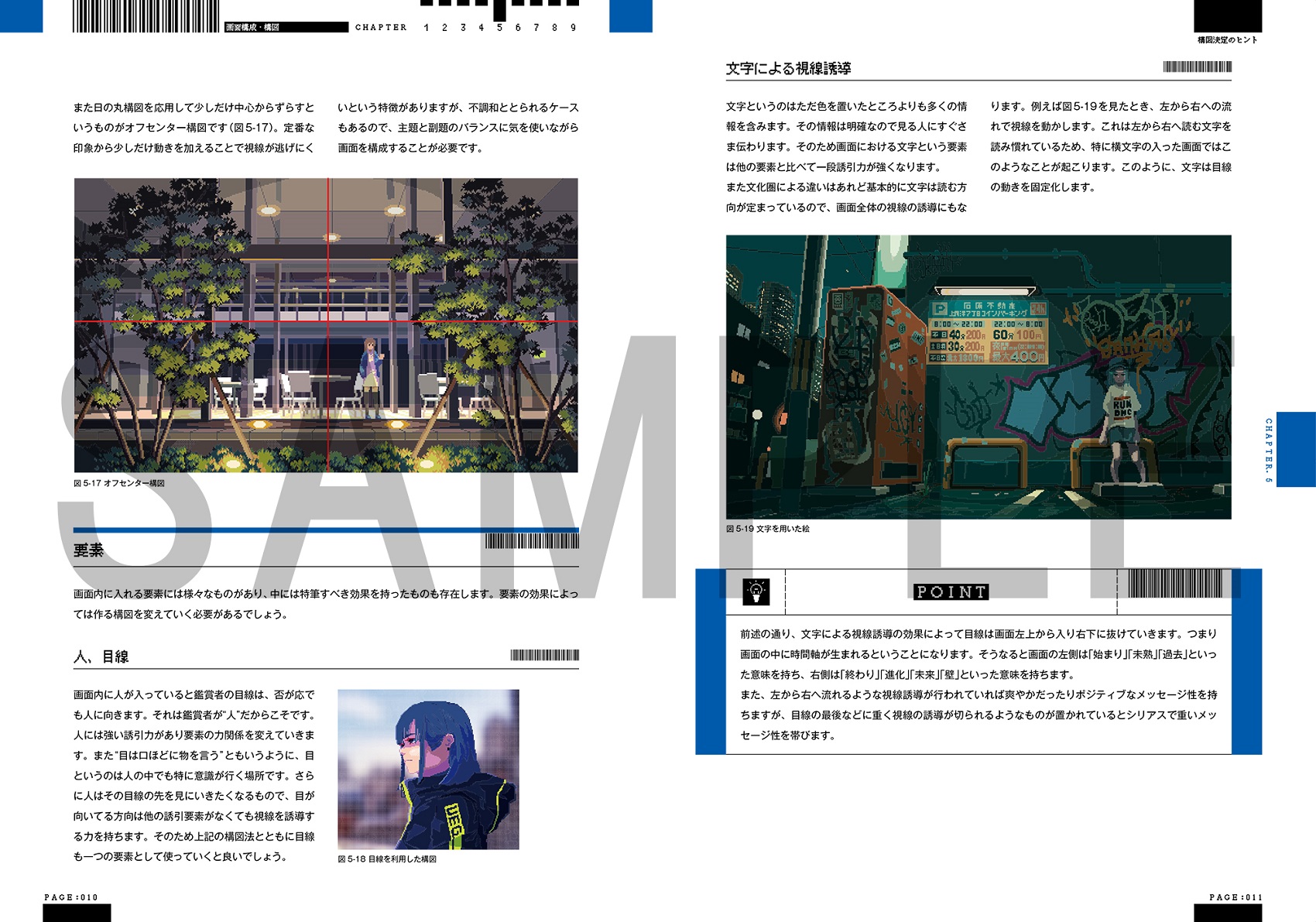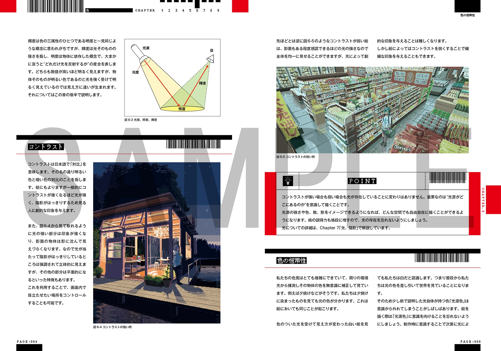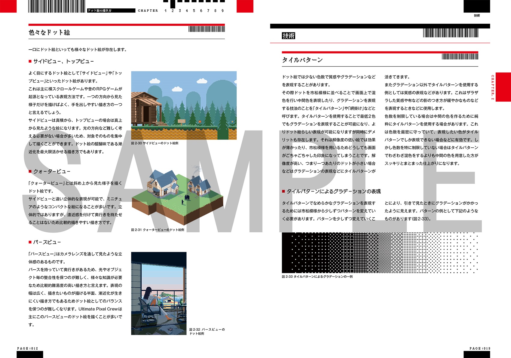 前編はピクセルアート(ドット絵)の歴史や描き方からはじまり、色、光、構図、パース、テクスチャにいたるまで、背景シーンを描くために必要な基礎知識を多数のピクセルアート作品を用いて解説。
