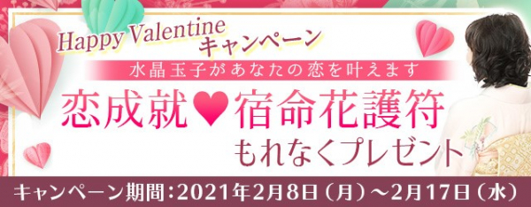 『ハッピーバレンタインキャンペーン~水晶玉子があなたの恋を叶えます【恋愛成就・宿命花護符】もれなくプレゼント』ではユーザーの恋が叶うよう、期間中、水晶玉子監修の特別・恋愛鑑定を提供します。