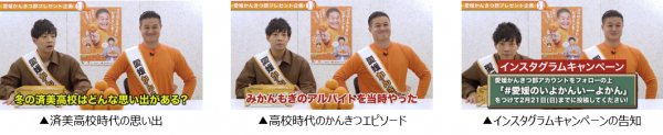 動画内ではティモンディの2人が済美高校時代の部活の思い出やいよかんにまつわるエピソードを振り返りながら、受験生に向けてエールを送る様子やインスタグラムでの合格祈願いよかんプレゼントキャンペーンの概要がご覧頂けます。